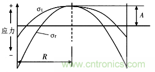 圖3:周邊固支圓平膜片表面應力示意圖