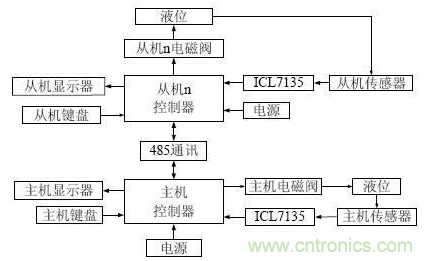 基本工作流程為:主機通過鍵盤設定自己和從機的液位,超聲波傳感器測出當前水位對應的電壓值,再經過ICL7135 模數(shù)轉化送入控制器與設定值比較,單片機通過控制電磁閥調節(jié)主機液位,并把設定值與當前值顯示在LCD 上;主機控制器通過485 通訊對從機控制器傳輸設定值,從機控制器也可以如主機控制器一樣對液位進行控制,并通過LCD 顯示主機給定值與當前液位值;并利用485 通訊把從機當前液位傳送給主機顯示出來。