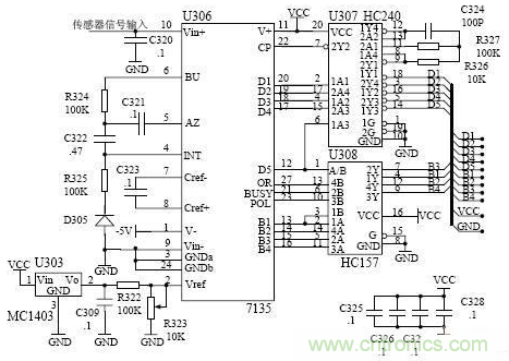 本電路由一個小型集成電路來實現(xiàn),采樣后的信號經過電位器送到ICL7135 進行處理,將處理后信號直接送到單片機最小系統(tǒng)。ICL7135 量程為0~2V,基準電壓由MC1403 輸出(2.5V)分壓獲得1V 電壓。