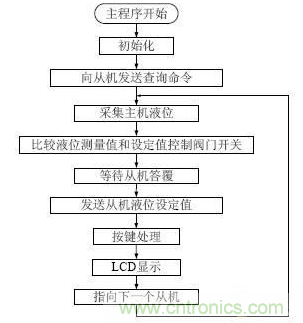 軟件部分主要是利用51 系列單片機作控制器,傳感器輸出電壓進行采樣,將采樣值與設定值比較,單片機對電磁閥控制來調節(jié)液位,主機通過485 通訊給分機設定數(shù)值,分機控制器對分機液位進行控制。軟件部分包括ICL7135 采樣部分、485 通訊部分、數(shù)字處理部分、顯示部分、鍵盤部分等。為了避免在傳感器移動造成測量數(shù)據(jù)不準確,特別增加了調零功能,進一步提高了系統(tǒng)的準確性。主程序流程圖如圖4 所示。