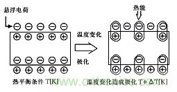 當(dāng)一些晶體受熱時(shí),在晶體兩端將會(huì)產(chǎn)生數(shù)量相等而符號(hào)相反的電荷,這種由于熱變化產(chǎn)生的電極化現(xiàn)象,被稱(chēng)為熱釋電效應(yīng)。通常,晶體自發(fā)極化所產(chǎn)生的束縛電荷被來(lái)自空氣中附著在晶體表面的自由電子所中和,其自發(fā)極化電矩不能表現(xiàn)出來(lái)。當(dāng)溫度變化時(shí),晶體結(jié)構(gòu)中的正負(fù)電荷重心相對(duì)移位,自發(fā)極化發(fā)生變化,晶體表面就會(huì)產(chǎn)生電荷耗盡,電荷耗盡的狀況正比于極化程度,圖1表示了熱釋電效應(yīng)形成的原理。