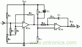 由D1、R15~R18、C6及IC 2C組成,由R18引入正反饋。當(dāng)前級信號頻率低于一定值F1時(shí),IC 2C的8腳輸出低電平;當(dāng)前級信號頻率高于一定值F2時(shí),IC 2C的8腳輸出高電平。臨界過渡區(qū)頻率范圍FW=F2-F1,適當(dāng)?shù)腇W可以有效防止檢測信號臨界過渡區(qū)的輸出振蕩,使得檢測動(dòng)作可靠。