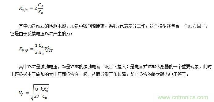 MEMS傳感器的工作原理基于這樣一個事實:給MEMS施加一個輸入力(Fin)將產生一定的位移,進而改變MEMS電容(Cout)。這個Cout可以用連接MEMS單元的電路進行測量。帶激勵電極的MEMS傳感器建模如圖1所示。這個模型的增益是Kx/c,代表由于MEMS質量塊位移引起的輸出電容變化。Kx/c等于: