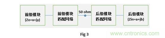 間接匹配,如Fig 3所示。把前級輸出阻抗和后級輸入阻抗,分別匹配到50ohm。這樣前后級就通過50ohm這個“中間人”匹配到了一起,這就是所謂的間接匹配。