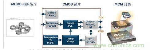 MEMS硅晶振由于采用全自動(dòng)化的半導(dǎo)體工藝,內(nèi)部兩個(gè)晶片(一個(gè)是MEMS諧振晶片、一個(gè)是具有溫補(bǔ)功能的鎖相環(huán)CMOS電路)采用MCM封裝在一起。