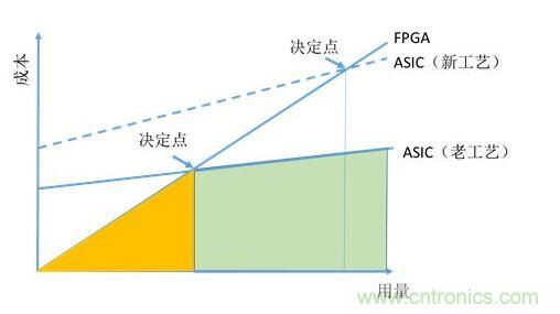 從上圖可以看出,F(xiàn)PGA由于沒有NRE,在用量較小的時候成本優(yōu)勢明顯。由于FPGA單個芯片成本高于ASIC,所以有較大斜率。在決定點位置以后,ASIC開始有成本優(yōu)勢。所以從成本因速考慮選用FPGA還是ASIC,與用量有很大關(guān)系。