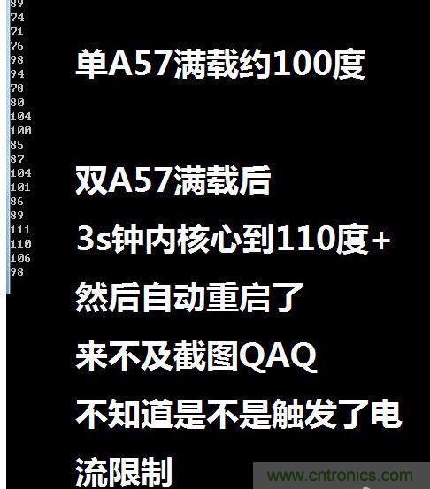 那么810的功耗有多高呢,根據貼吧大神(炮神)ioncannon的分析,在Z9 Max上,810的單核心功耗最高可以達到5W(注意是單核心!單核心!單核心! 重要的事情要說三遍),雙核A57同時滿載3S就發(fā)熱達到110攝氏度,并自動重啟了,想測試下雙核的功耗都以為爆機沒辦法測試了。