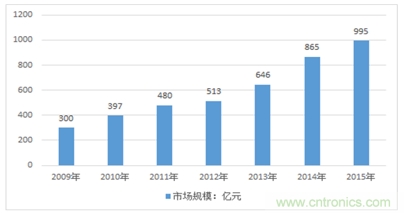 近年來,國內(nèi)傳感器市場持續(xù)快速增長,年均增長速度超過20%,2011年傳感器市場規(guī)模為480億元,2012年達(dá)到513億元,2015年則達(dá)到995億元。近幾年我國傳感器行業(yè)市場規(guī)模情況如下圖所示: