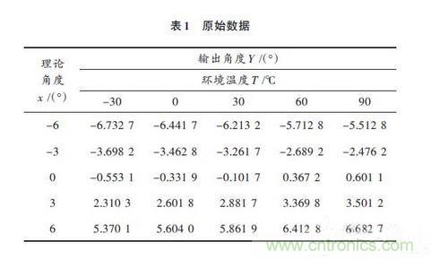 由于各軸的檢測原理是相同的,因此本論文采用x軸的檢測數據進行實驗驗證。主要的實驗儀器有被測姿態傳感器、經緯儀、高低恒溫箱、高精度角度檢測儀等。表1所得數據是未經溫度補償時的實驗數據,即原始數據。
