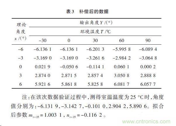 根據式(1)、(2)、(7)可得補償后的輸出值。償后的數據如表3所示。在表1中未補償前的最大誤差角度為0.682 7°,表3中補償后的最大誤差角度為0.261 6°,相對減少的誤差角度為0.421 1°。