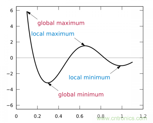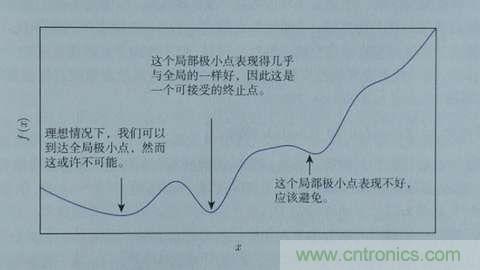 這樣,斜率為0時我們其實就得到了函數f在該點可以得到最小值。那么,把x向左或者向右移一點,到底移多少呢?如果移多了,可能移過了,如果移得很少,則可能要移很久才能找到最小點。還有一個問題,如果f(x)操作函數有多個局部最小點、全局最小點時,如果x移的非常小,則可能導致通過導數只能找到某個并不足夠小的局部最小點。如下圖所示:
