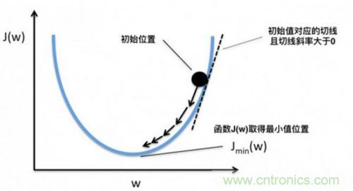 根據導數判斷損失函數f在x0點上應當如何移動,才能使得f最快到達最小值的方法,我們稱為梯度下降。梯度也就是導數,沿著負梯度的方向,按照梯度值控制移動步長,就能快速到達最小值。當然,實際上我們未必能找到最小點,特別是本身存在多個最小點時,但如果這個值本身也足夠小,我們也是可以接受的,如下圖所示: