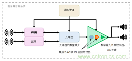 處理器執(zhí)行各種音頻處理功能,如解碼和信號(hào)均衡,同時(shí)也處理Wi-Fi和/或藍(lán)牙通信軟件堆棧。過去,CD品質(zhì)的采樣頻率可能已足夠。但是今天的高保真音頻系統(tǒng)對(duì)信號(hào)鏈中的處理器提出了其它要求,因?yàn)楦弑U嬉糍|(zhì)要求在24位音樂信號(hào)流中提供48kHz至192kHz范圍內(nèi)的采樣率。