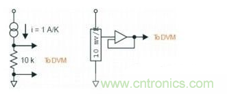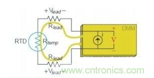 與熱敏電阻相似,鉑電阻溫度傳感器(RTD)也是用鉑制成的熱敏感電阻。當通過測量電壓計算RTD 溫度時,數字萬用表用已知電流源測量該電流源所產生的電壓。這一電壓為兩條引線(Vlead)上的壓降加RTD上的電壓(Vtemp)。例如,常用RTD 的電阻為100Ω,每1℃僅產生0.385Ω的電阻變化。如果每條引線有10Ω電阻,就將造成26℃的測量誤差,這是不可接受的。所以應對RTD作4線歐姆測量。