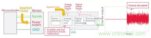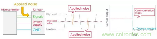 以上這樣,One chip傳感器的信號線或電源線施加噪聲時,會發生通信停止或輸出值紊亂的誤操作。