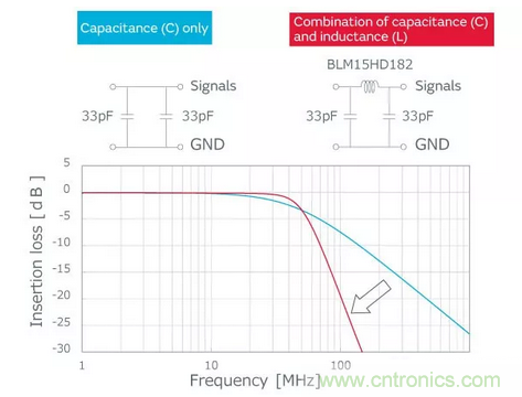 噪聲級別小或信號和噪聲的頻率相差大的情況下,可以只用電容器進行降噪,但如果信號頻率和噪聲頻率相近時,需要電感器和電容器組合來構成插入損耗陡峭的濾波器。