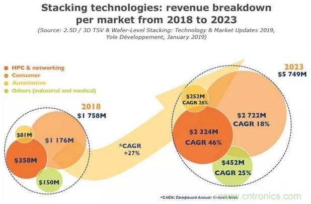 消費(fèi)類市場(chǎng)(主要是CIS應(yīng)用),是2018年堆疊封裝營收的最大貢獻(xiàn)者,占據(jù)了65%以上的市場(chǎng)份額。盡管如此,高性能計(jì)算(HPC)是推動(dòng)3D封裝技術(shù)創(chuàng)新的主要應(yīng)用,到2023年期間,該應(yīng)用增長(zhǎng)速度最快,市場(chǎng)份額預(yù)計(jì)將從2018年的20%增長(zhǎng)到2023年的40%。