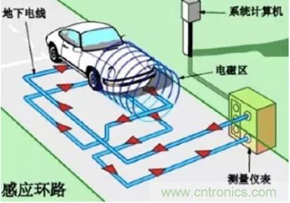 目前,道路檢測(cè)交通流狀態(tài)用的最多的傳感器件是環(huán)形線圈,它可以檢測(cè)交通量、車(chē)速、占有率、車(chē)頭時(shí)距、車(chē)長(zhǎng)、長(zhǎng)車(chē)比和車(chē)輛存在等多個(gè)項(xiàng)目。環(huán)形線圈檢測(cè)原理如圖所示。線圈由專用電纜繞幾匝(一般為4匝)及其饋線構(gòu)成,它通過(guò)一個(gè)變壓器接到被恒流源支持的調(diào)諧回路,有源環(huán)形線圈構(gòu)成LC調(diào)諧回路的電感部分,并在線圈周?chē)目臻g產(chǎn)生電磁場(chǎng)。當(dāng)含有鐵金屬的車(chē)體進(jìn)入線圈磁場(chǎng)范圍,車(chē)輛鐵構(gòu)件內(nèi)產(chǎn)生自成閉回路的感應(yīng)電渦流,此渦流又產(chǎn)生與原有磁場(chǎng)方向相反的新磁場(chǎng),導(dǎo)致線圈的總電感變小,引起調(diào)諧頻率偏離原有數(shù)值,從而發(fā)出車(chē)輛通過(guò)或存在的信號(hào)。