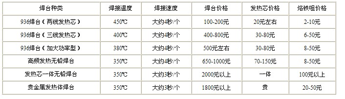 根據焊接的產品質量和工作效率及發熱芯、烙鐵頭(烙鐵咀)的價格,優先推選高頻發熱無鉛焊臺,第二推選936焊臺(加大功率型)。